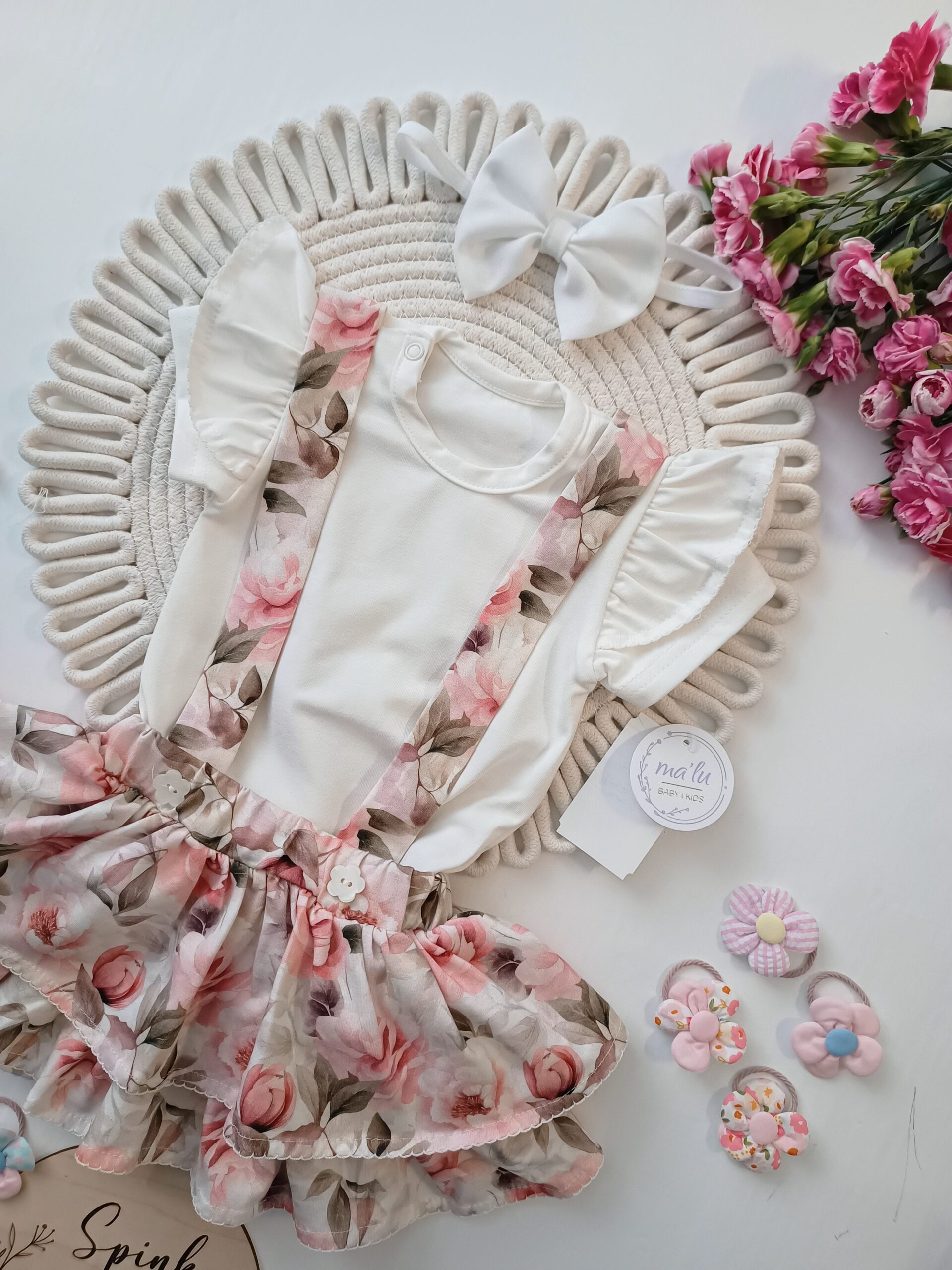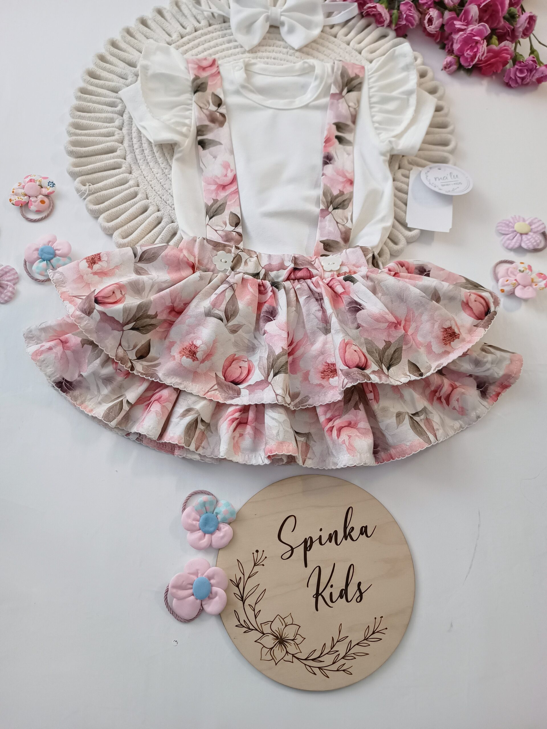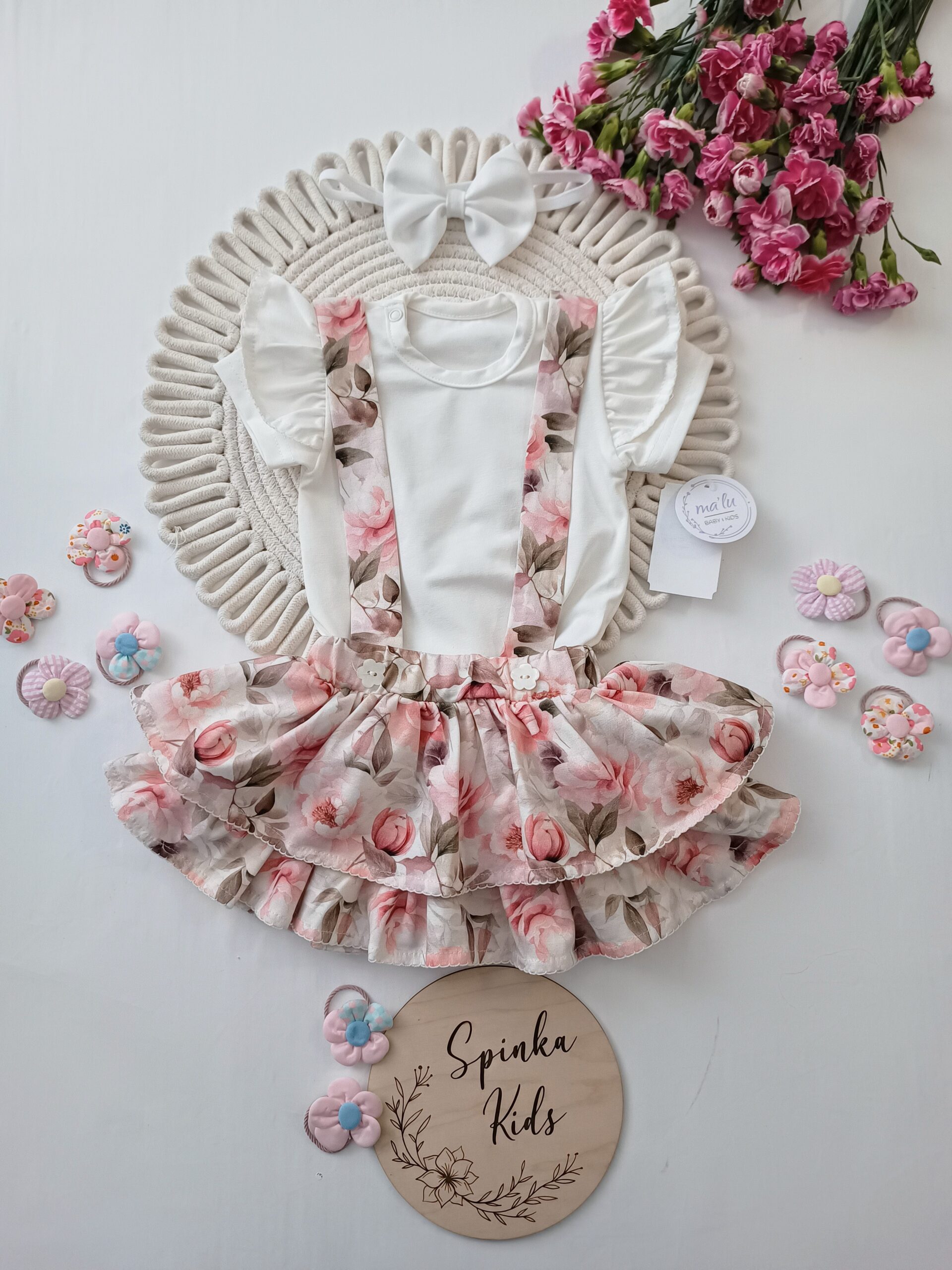 Polski Producent Ma’lu. Rozmiar 68,64,80,86-to body i spódniczka, a rozmiar 92,98,104- to bluzka i spódniczka.