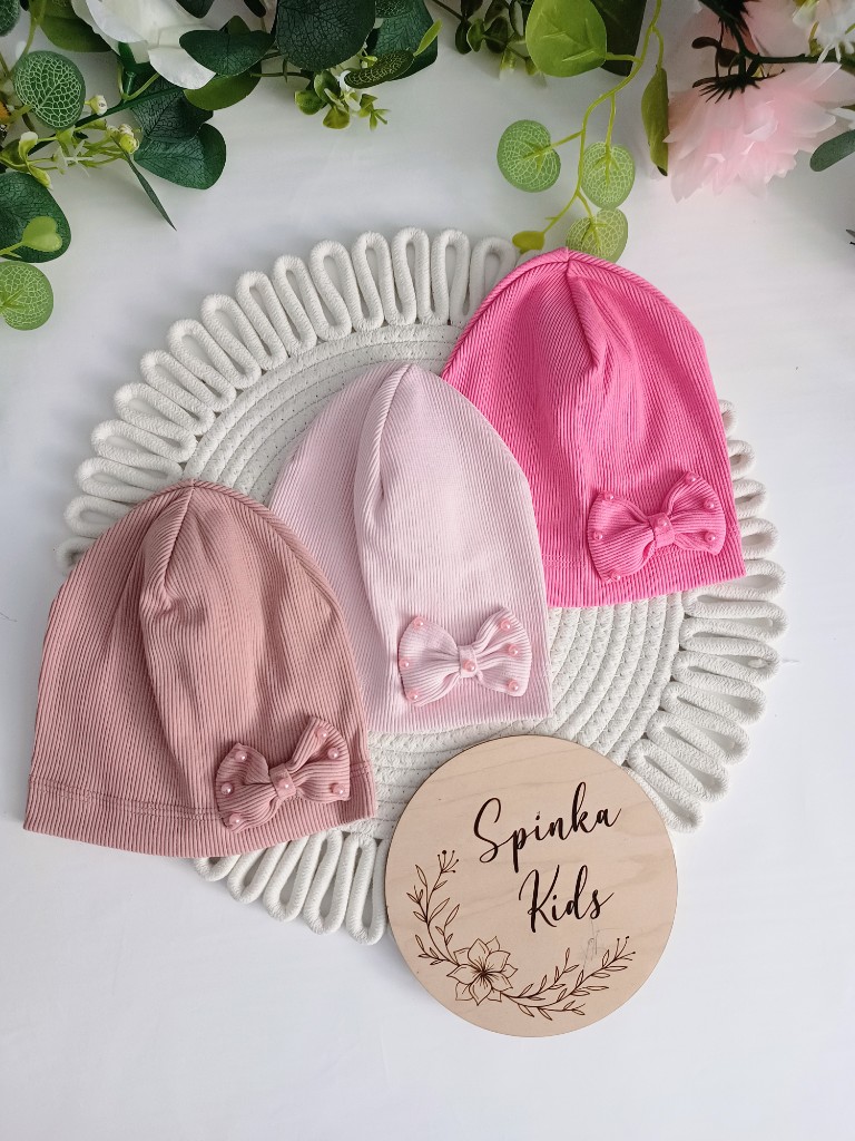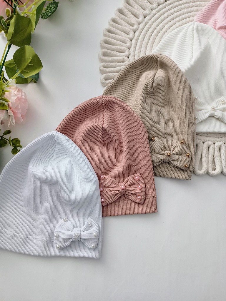 Polski Producent. Czapka z bawełny prążek. Z boku ozdobna kokarda. Dobra na wiek 2/4 lata.