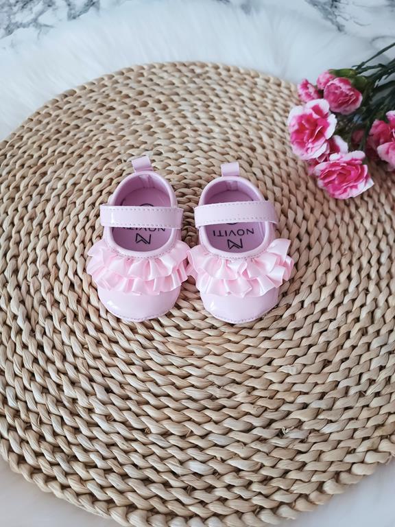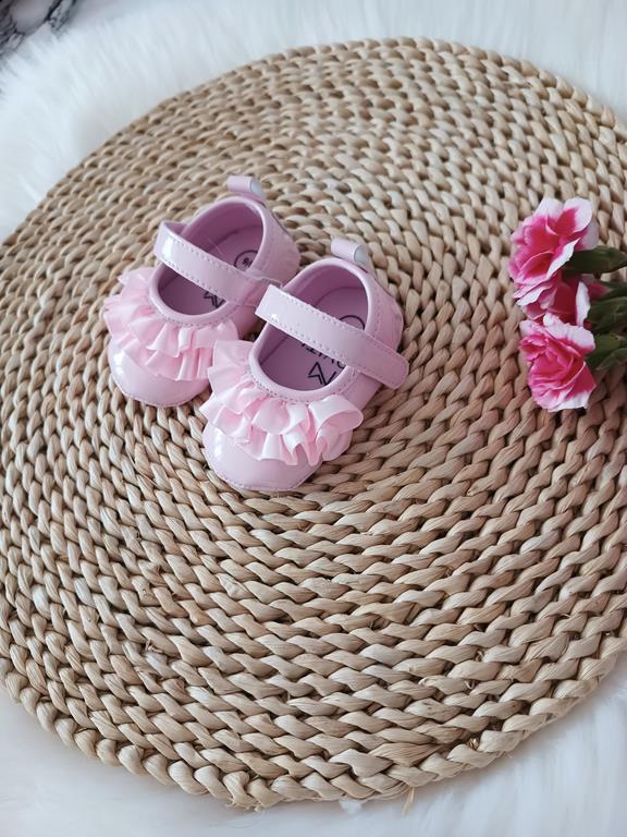 Lakierowane niechodki z falbanką różowe, zapinane na rzep. Polski Producent.