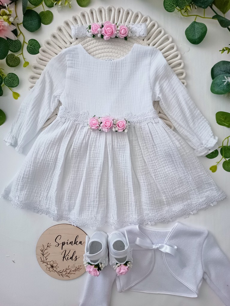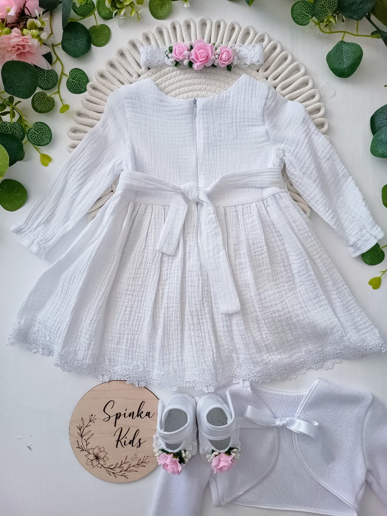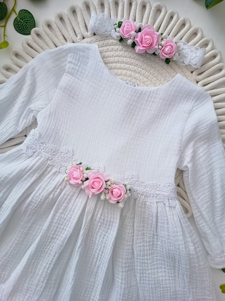 Bardzo efektowna propozycja z muślinu, miękka i miła dla ciała z bawełnianą cienką podszewką. Wykończone rękawki gumką. Koronka w talii i u dołu sukienki. Polski Producent.Bukiecik w pasie odpinany na rzep.