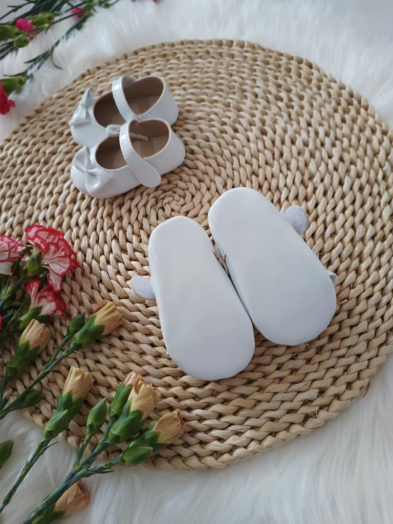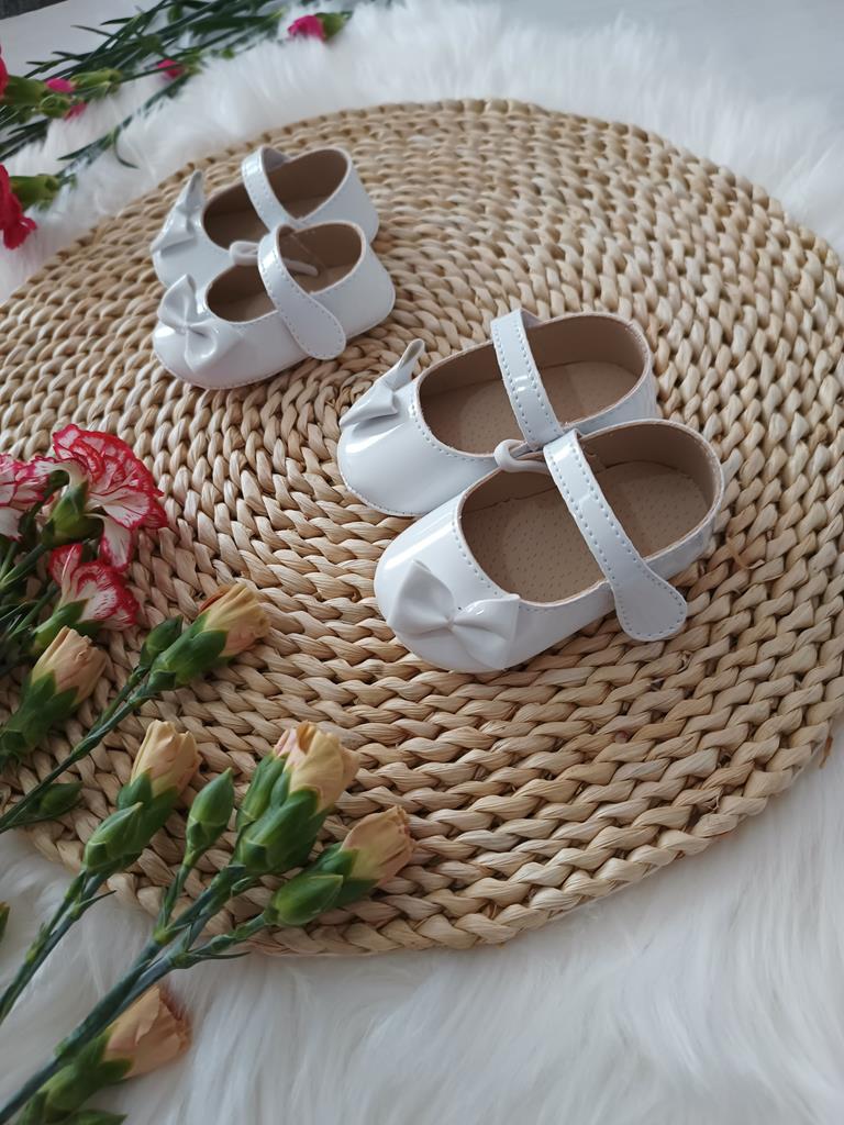Lakierowane niechodki z kokardką z przodu i zapięciem na na rzep. Produkt Polski.