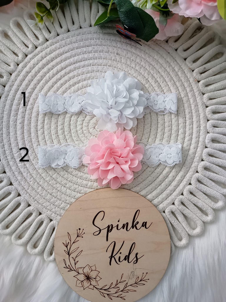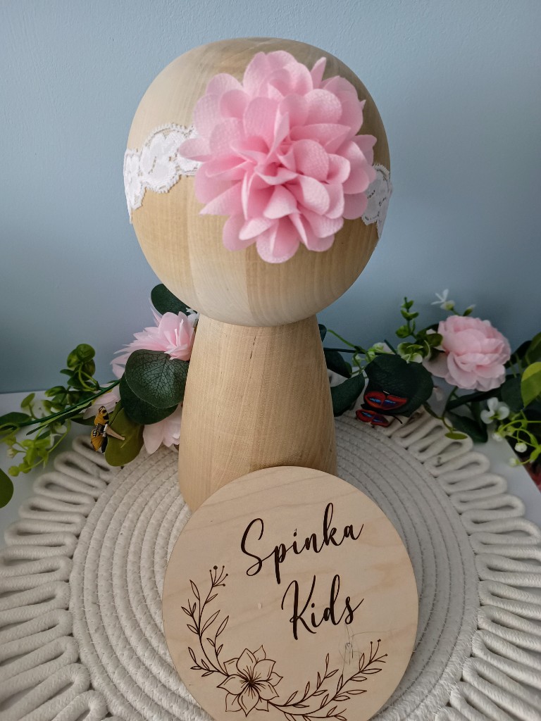 Opaska jest na ekastycznej koronce, dedykowana dla dzieci od 0 do 12 miesięcy.