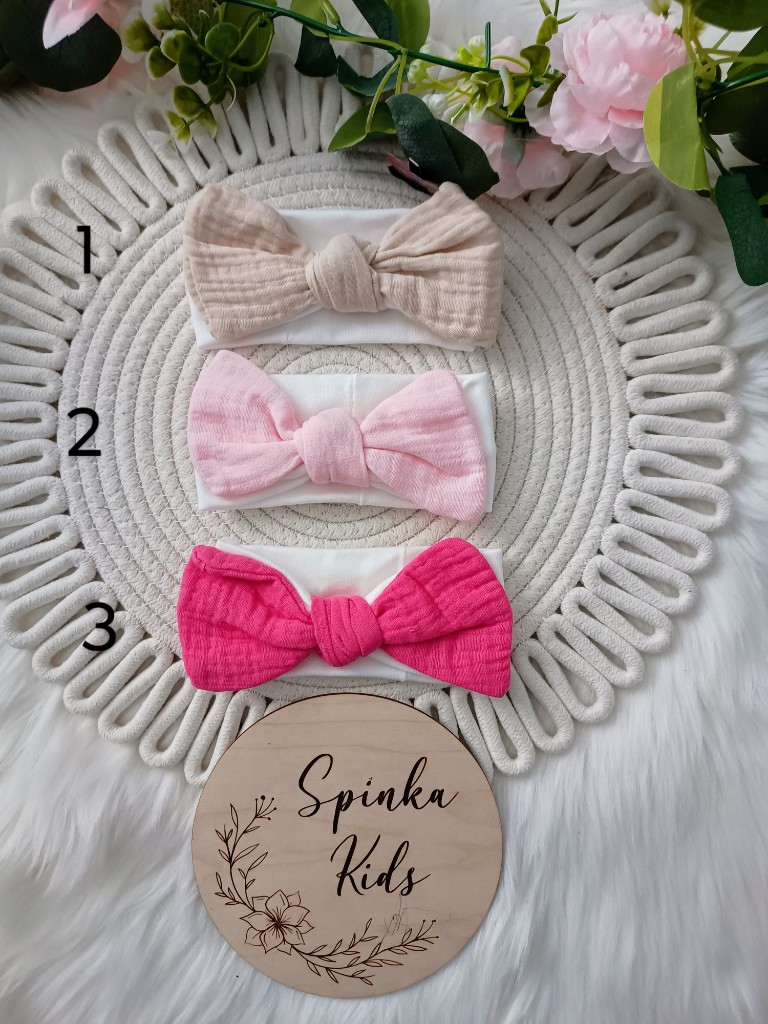 Polski producent. Bawełniana elastyczna i nieuciskowa opaska z dekoracyjną muślinową kokardą. Opaska dedykowana dla dzieci od 0 do 3 lata.