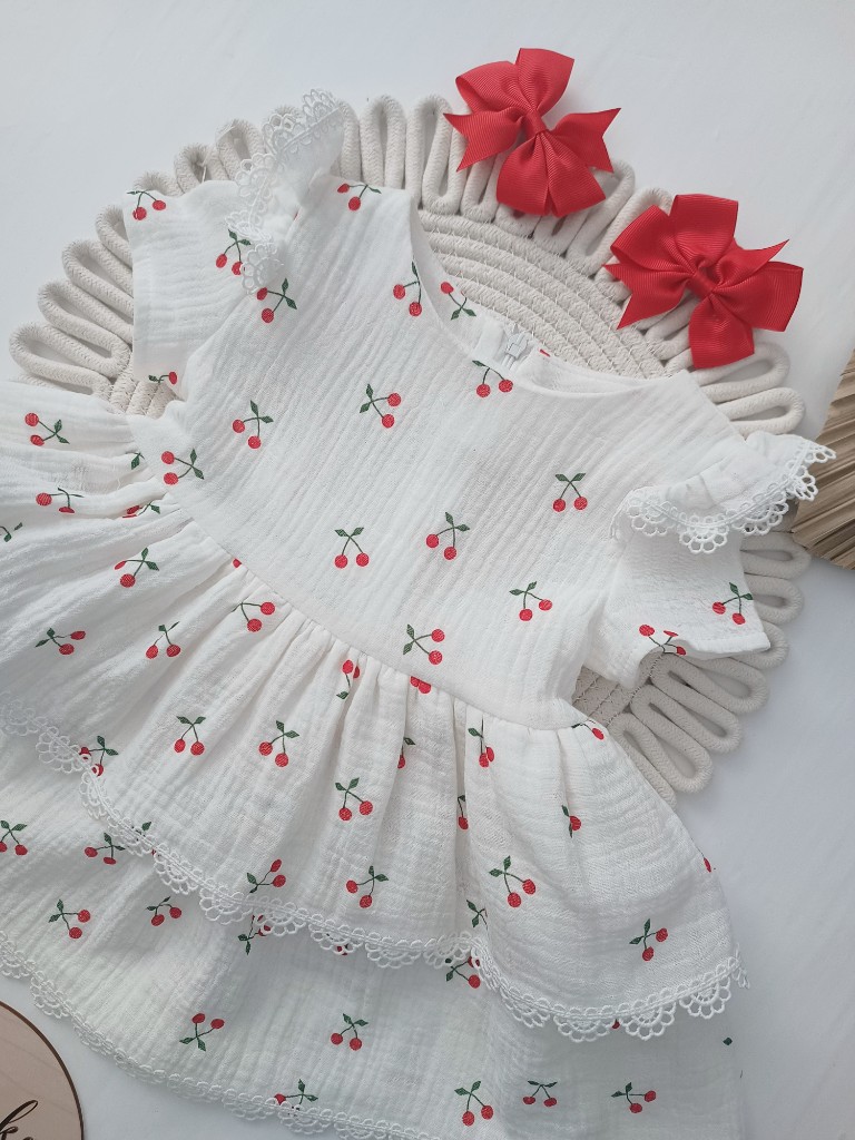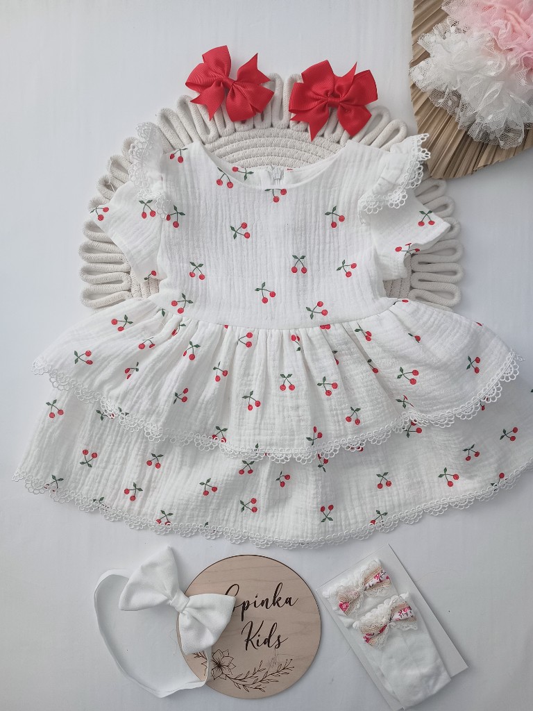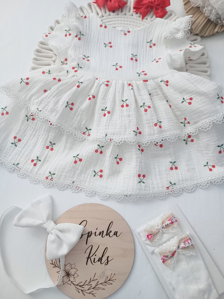 Sukienka muślinowa obszyta koronką. Polski Producent. Z tyłu zapinana na zamek ima paseczki do przewiązania w talii.