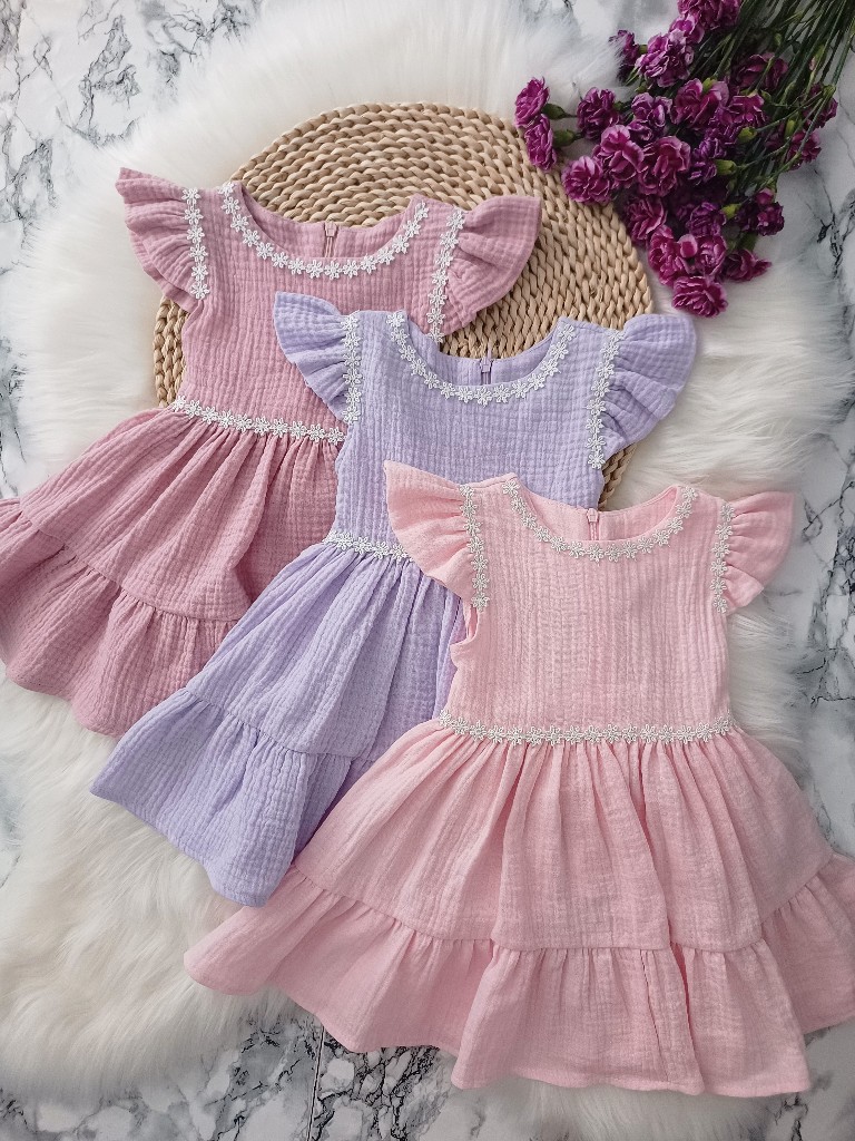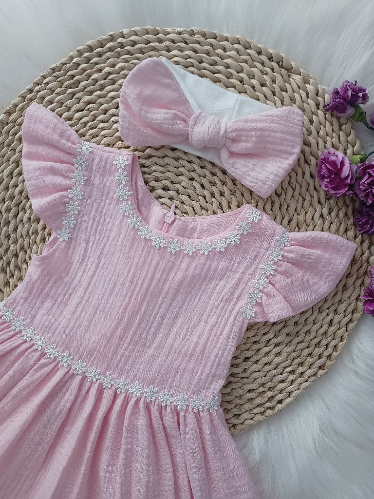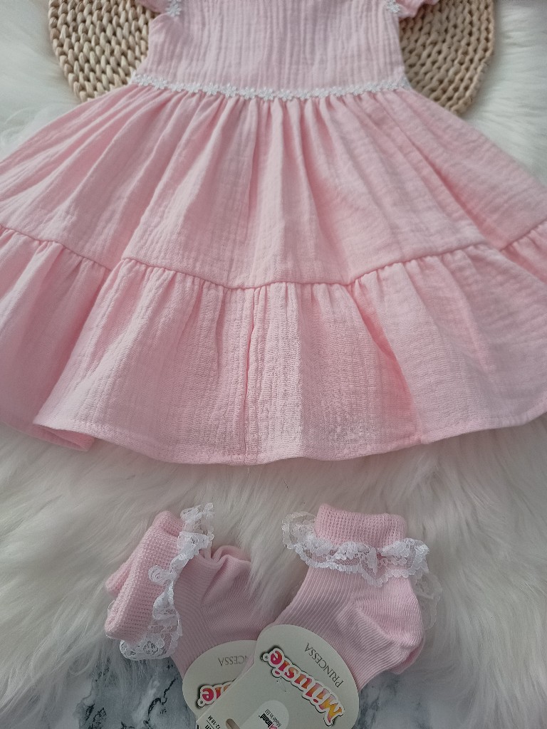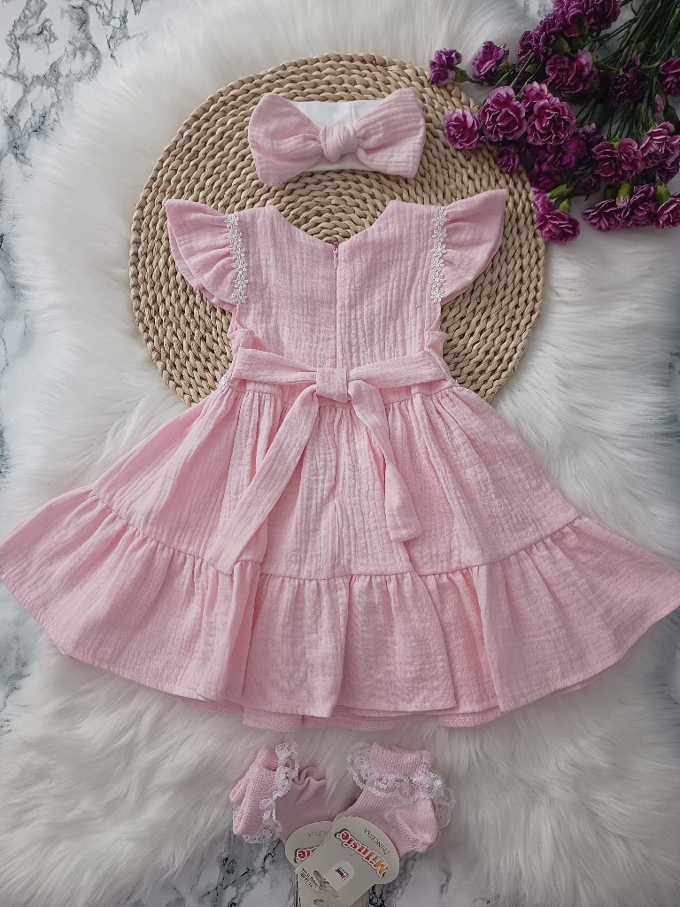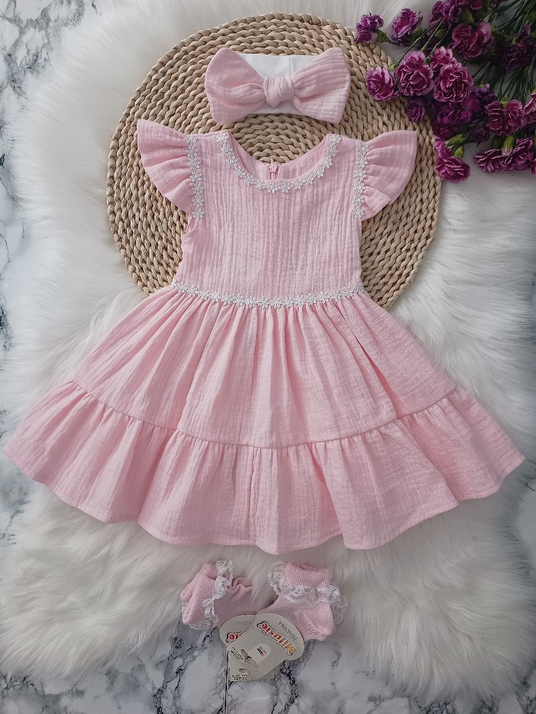 Muślinowa sukienka Polskiego Producenta. Bardzo wygodna i efektowna przez marszczenia które pięknie się układają po rozwiązaniu paseczków z tyłu. Sukienka muślinowa -100% bawełna najlepsza na lato. Opaska i skarpetki do kupienia osobno w naszym sklepie.