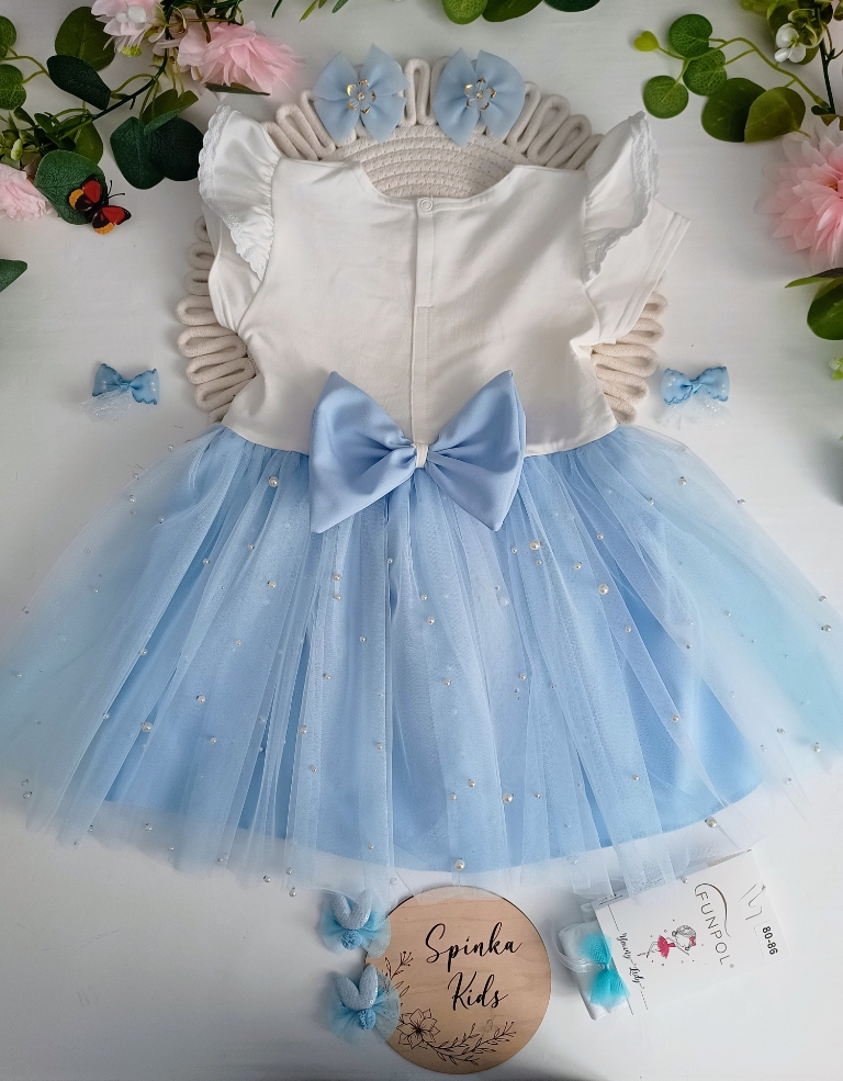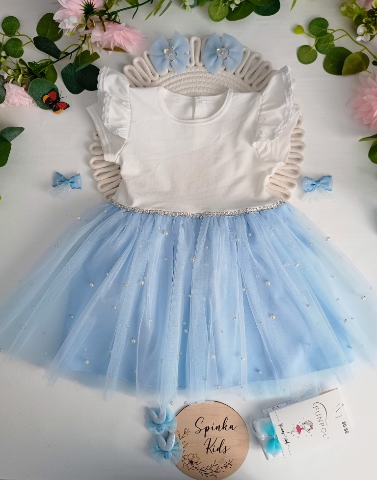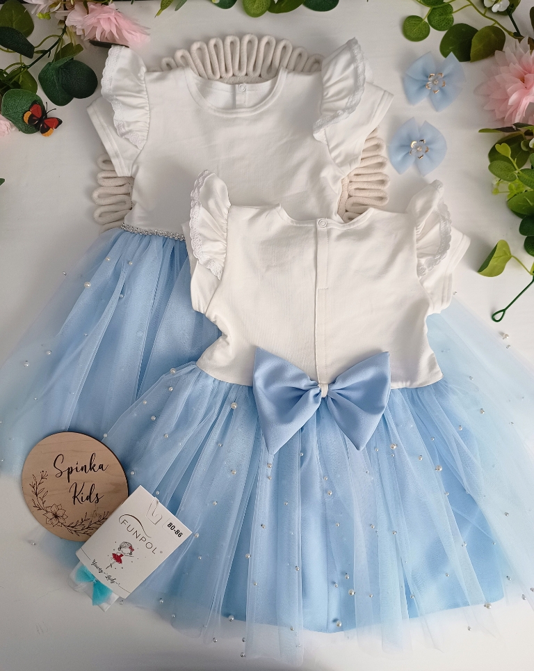 Polski Producent. Sukienka z miękkim i mieniącym się tiulem z perełkami, w pasie srebrny paseczek, z tyłu zapinana na napkę. Od góry bawełna z elastanem, bardzo ładnie się naddaje. Z tyłu dekoracyjna kokarda.