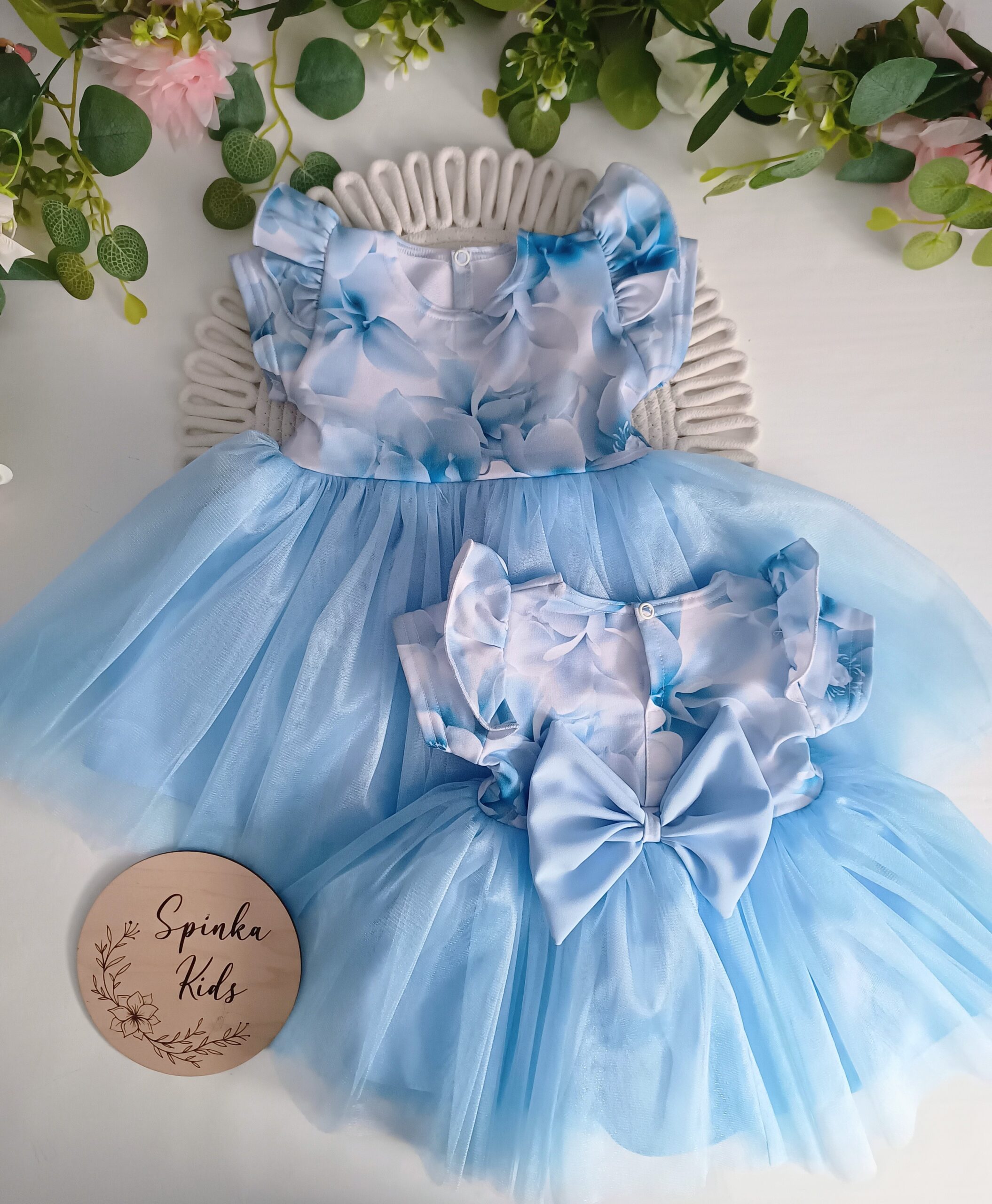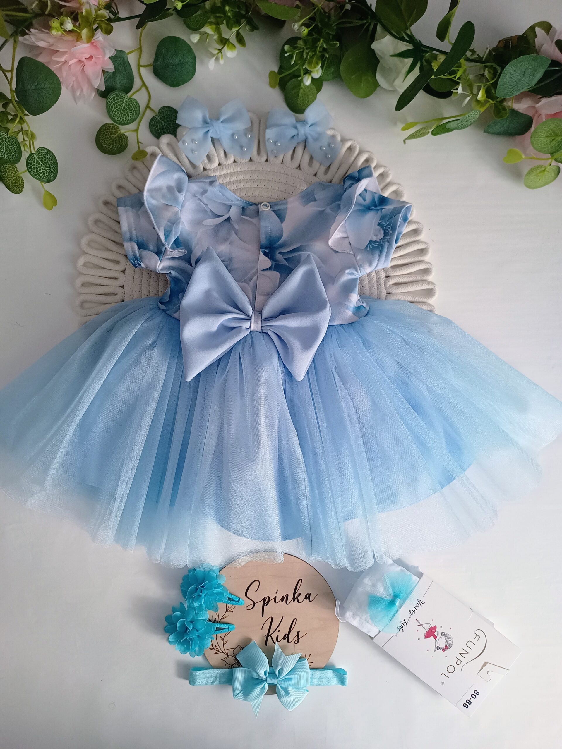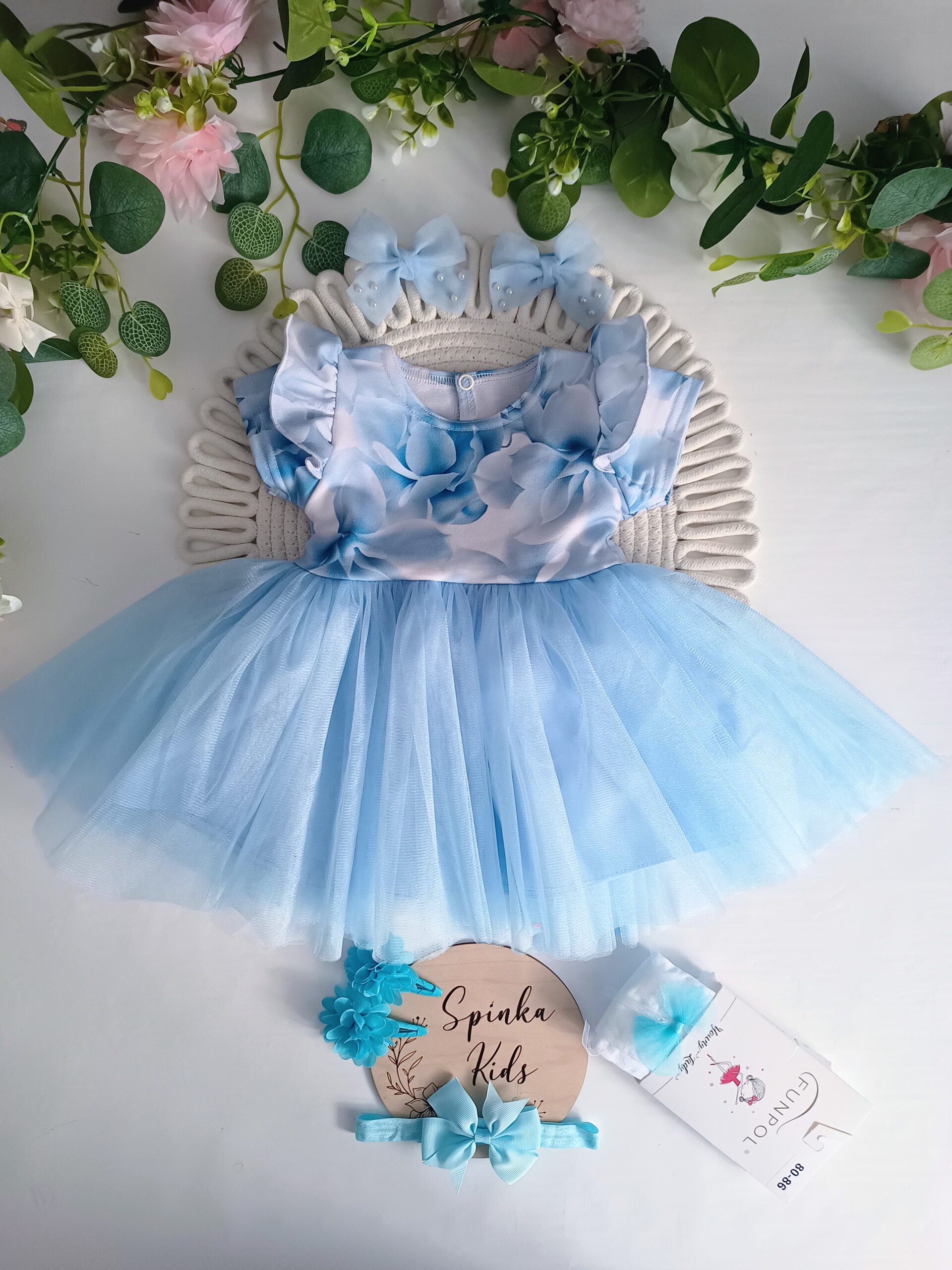Polski Producent. Góra sukienki bawełniana lekko się naddaje, zapinana z tyłu na napkę. Z tyłu dekoracyjna kokarda. Tiul miękki i mieniący się.