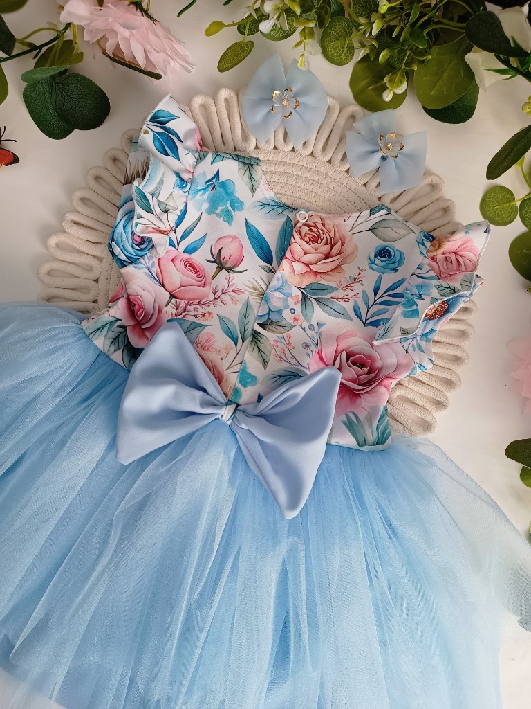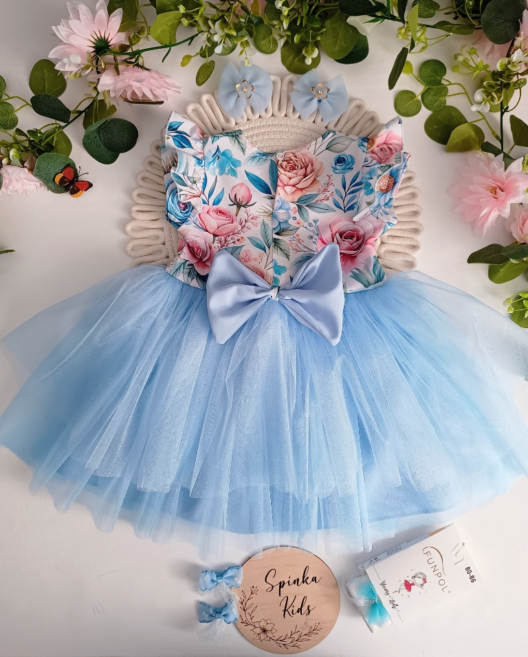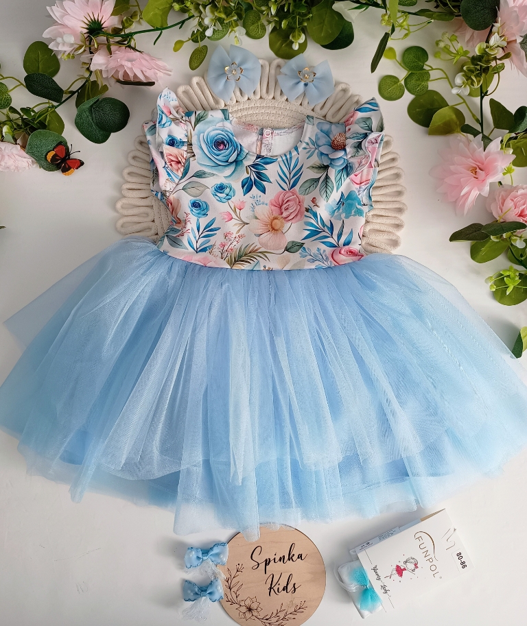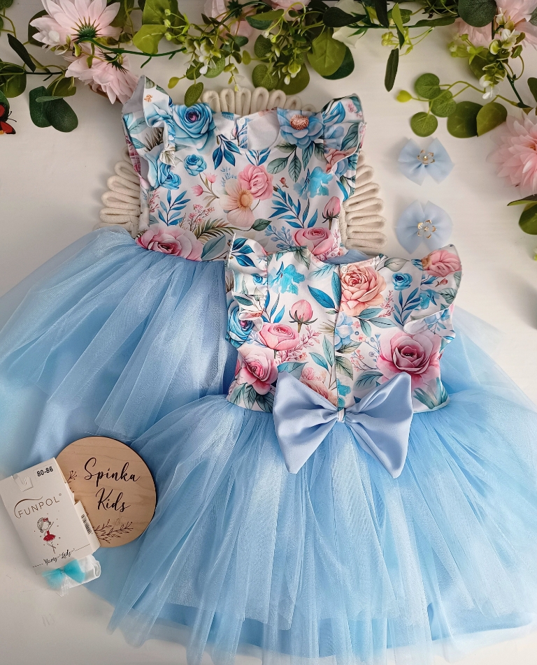 Polski Producent. Sukienka z miękkim i mieniącym się tiulem, z tyłu zapinana na napkę. Od góry bawełna z elastanem, delikatnie się naddaje. Z tyłu dekoracyjna kokarda.