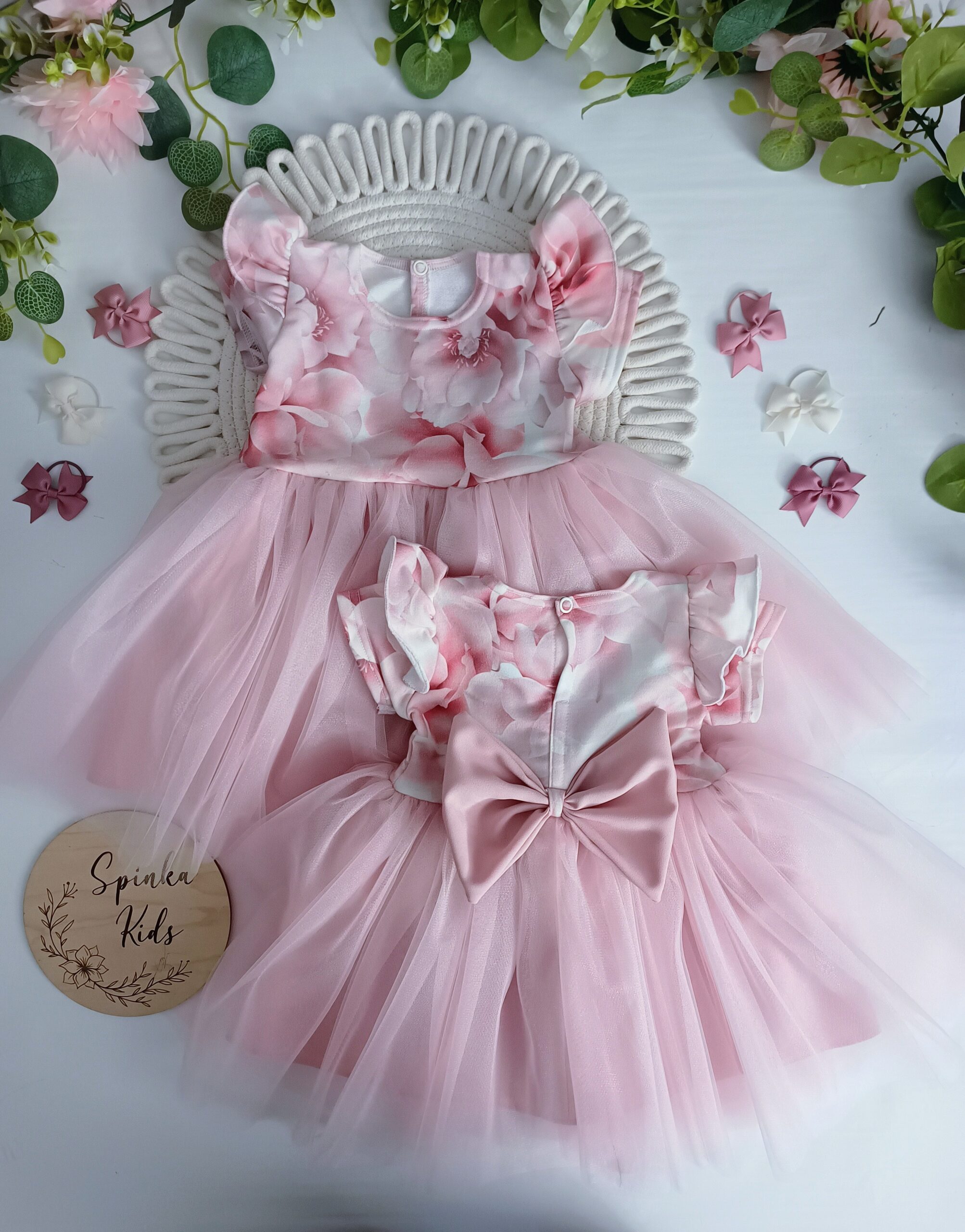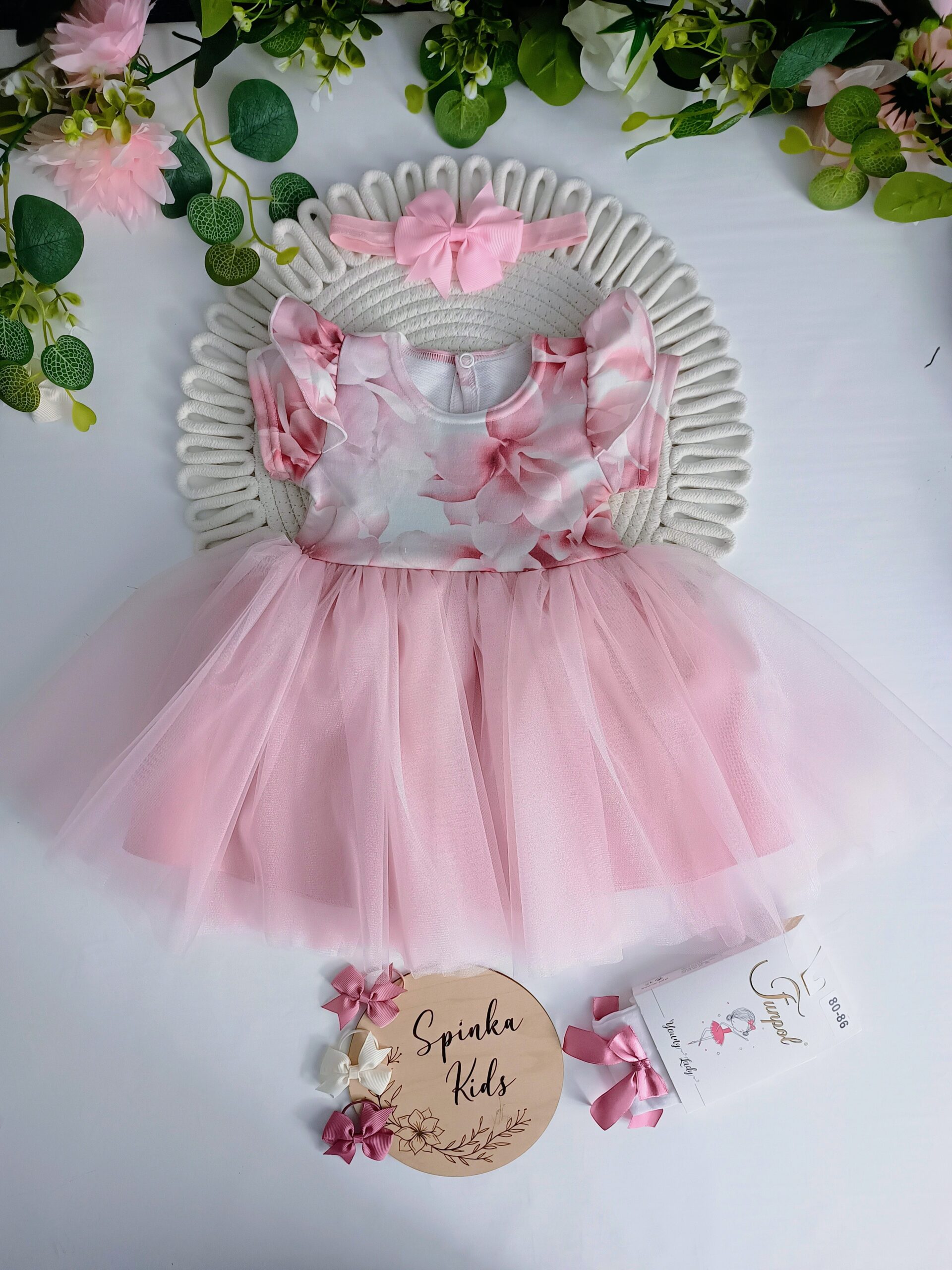 Polski Producent. Góra sukienki bawełniana lekko się naddaje, zapinana z tyłu na napkę. Z tyłu dekoracyjna kokarda. Tiul miękki i mieniący się.