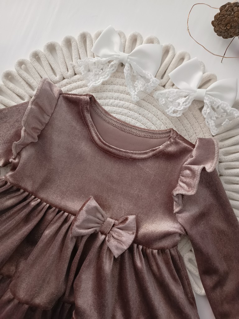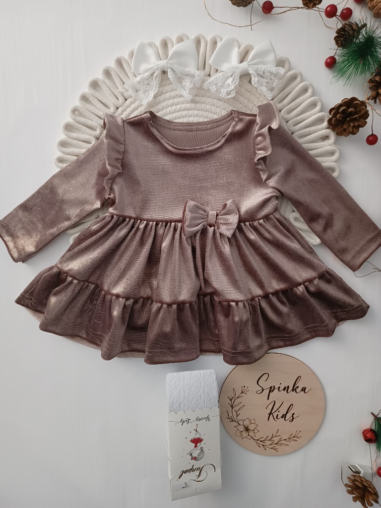 Polski Producent. Sukienka z weluru poliestrowegomieni sie na złoto. Elastyczna bardzo wkładana przez głowę bez zapięcia.