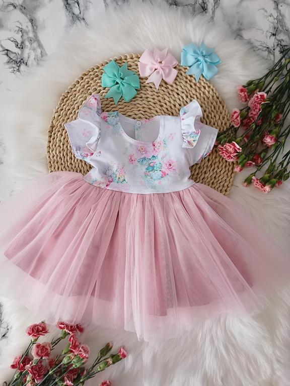 Piękny model tiulowej sukienki z dekoracyjną dużą kokardą z tyłu. Sukienka zapinana na napkę. Falbanki na ramionach. Tkanina odgóry to bawełna, któralekko się uciąga. Polski Producent.
