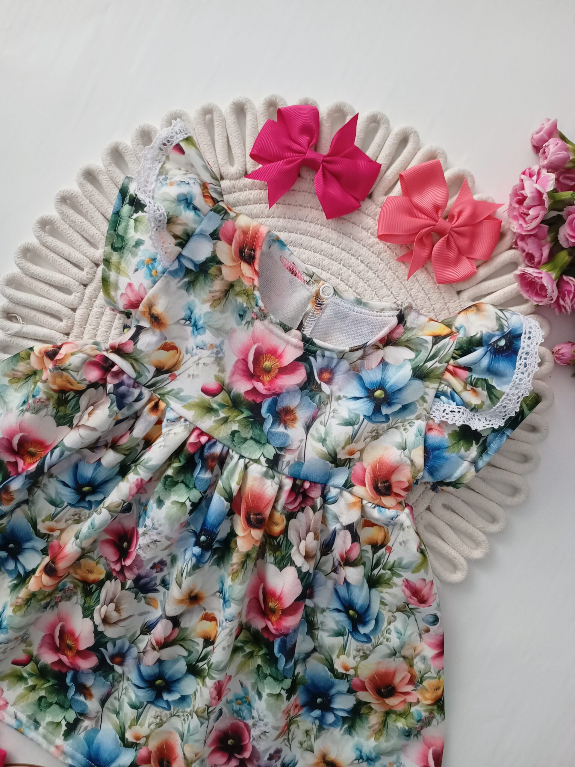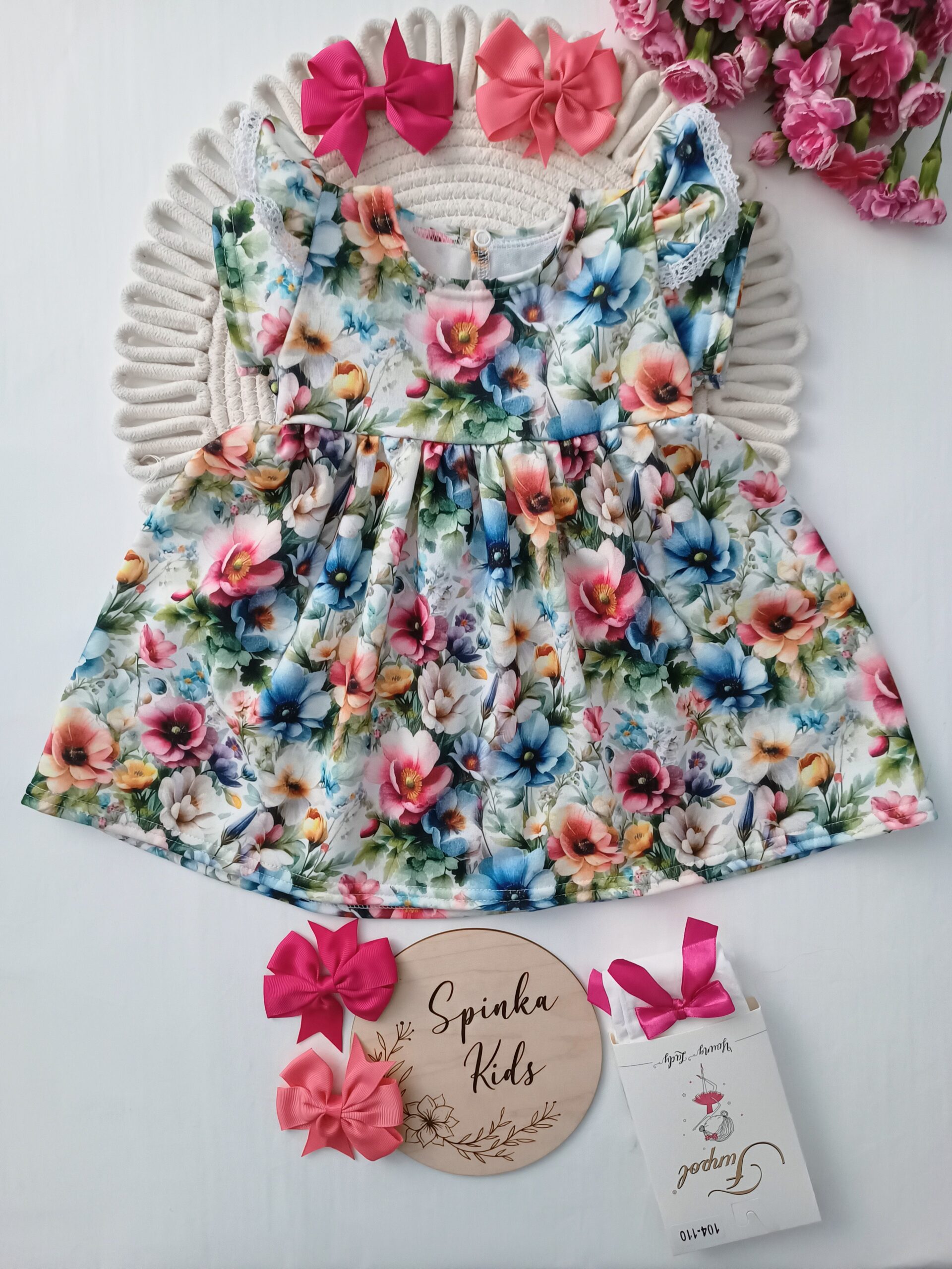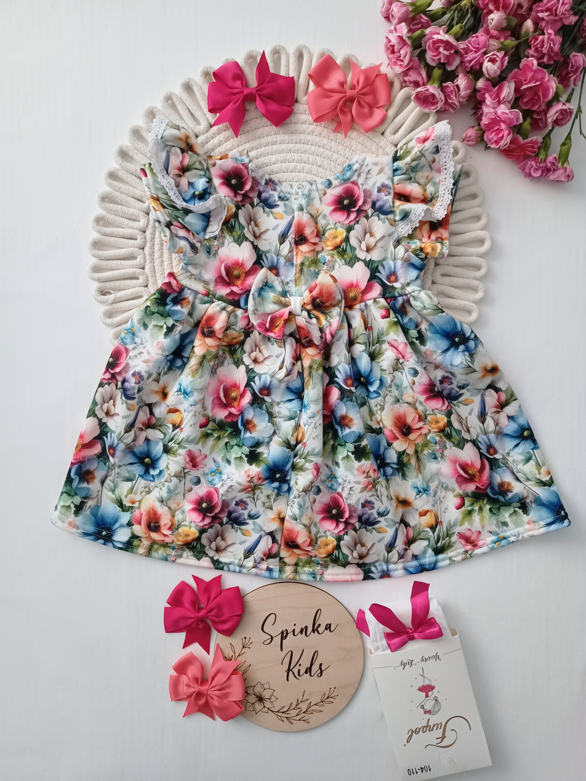 Polski Producent. Sukienka bawełniana z elastanem. Lekko się uciąga. Zapinana z tyłu na napkę. Na ramionach falbanki obszyte koronką. Z tyłu dekoracyjna kokarda.