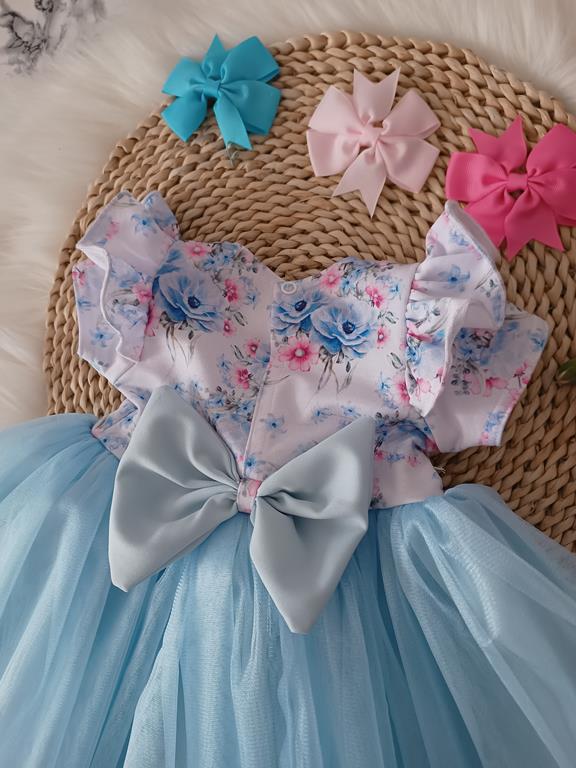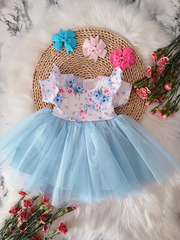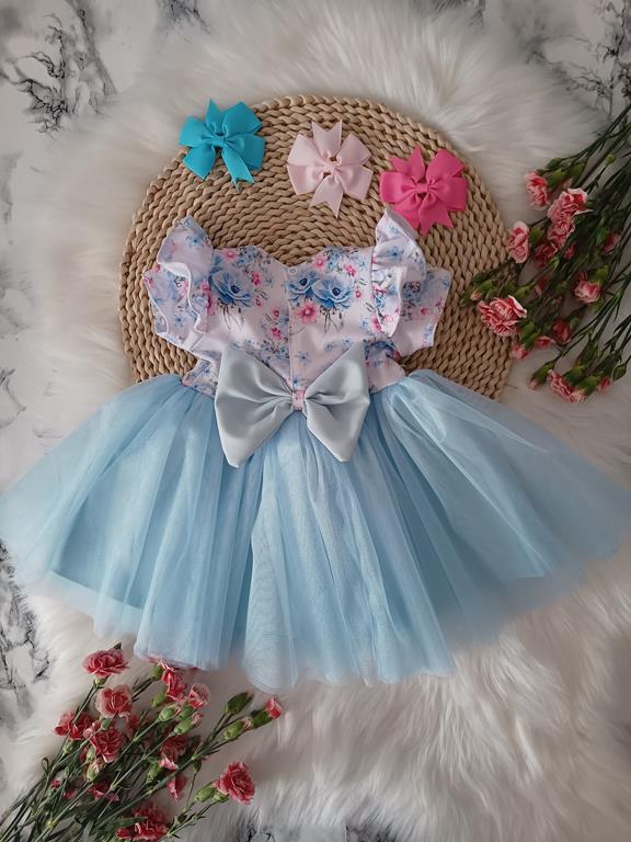 Piękny model tiulowej sukienki z dekoracyjną dużą kokardą z tyłu. Sukienka zapinana na napkę. Falbanki na ramionach. Tkanina odgóry to bawełna, któralekko się uciąga. Polski Producent.