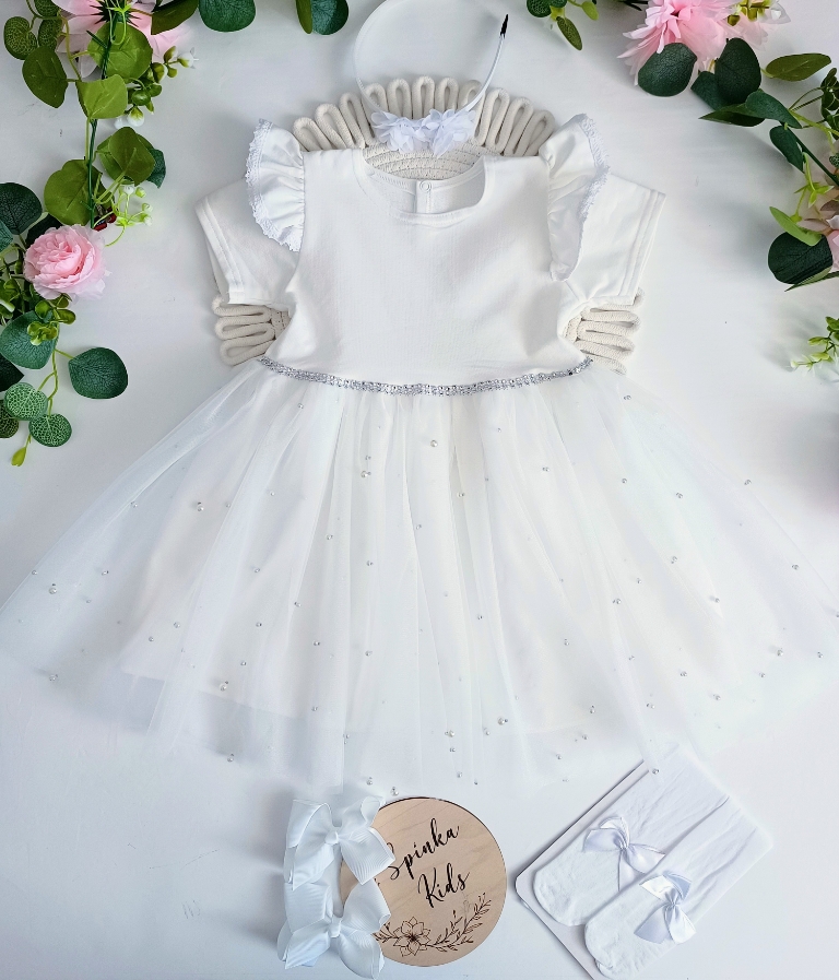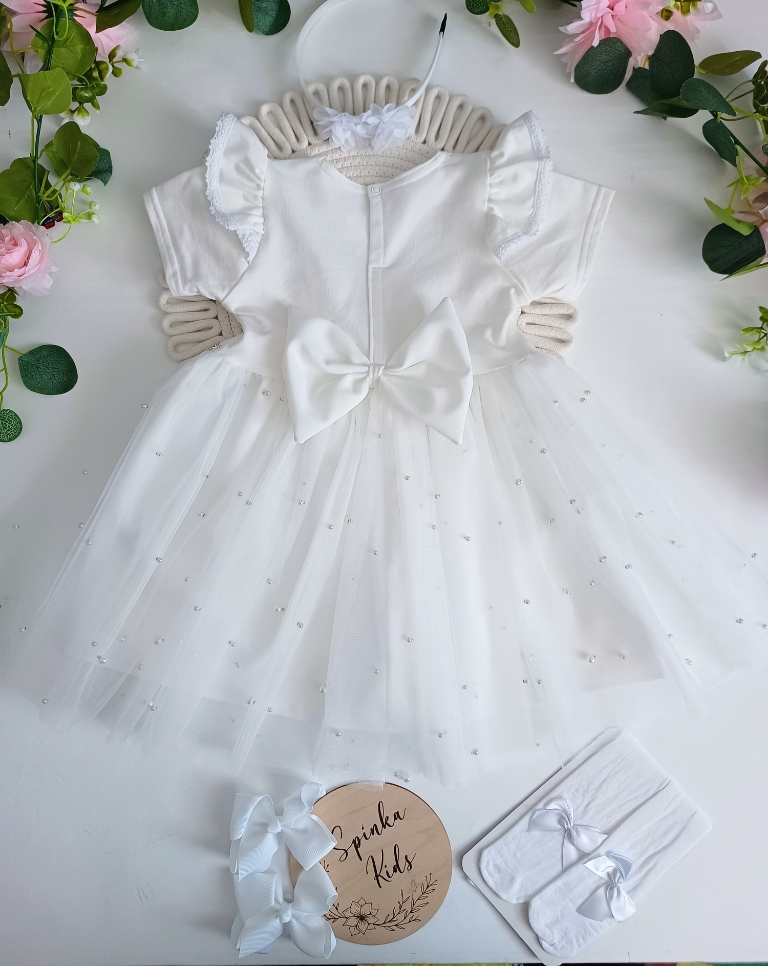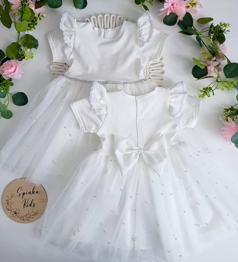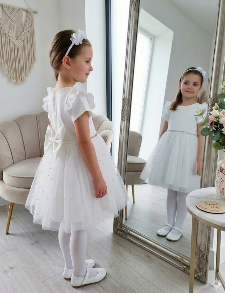 Polski Producent. Sukienka z miękkim i mieniącym się tiulem z perełkami, w pasie srebrny paseczek, z tyłu zapinana na napkę. Od góry bawełna z elastanem, bardzo ładnie się naddaje. Z tyłu dekoracyjna kokarda.