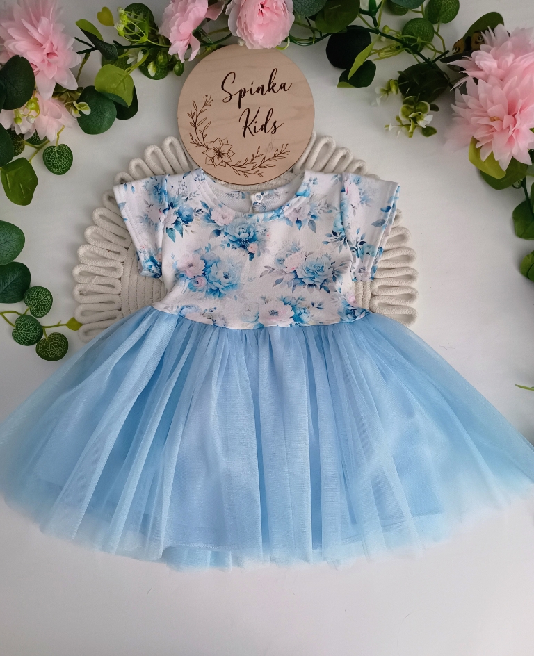 Sukienka z tiulem od Polskiego Producenta. Góra to bawełna z elastanem. Dół to miękki tiul mieniący się. Z tyłu dekoracyjna kokarda. Sukienka zapinana na napkę.