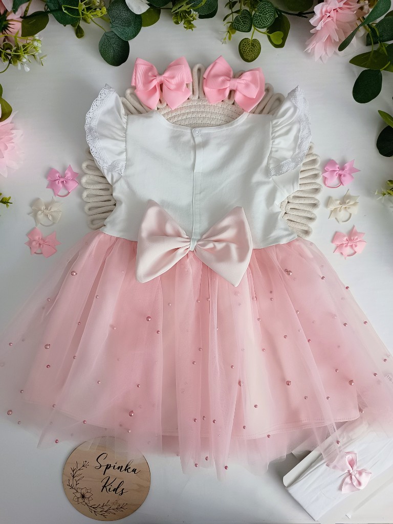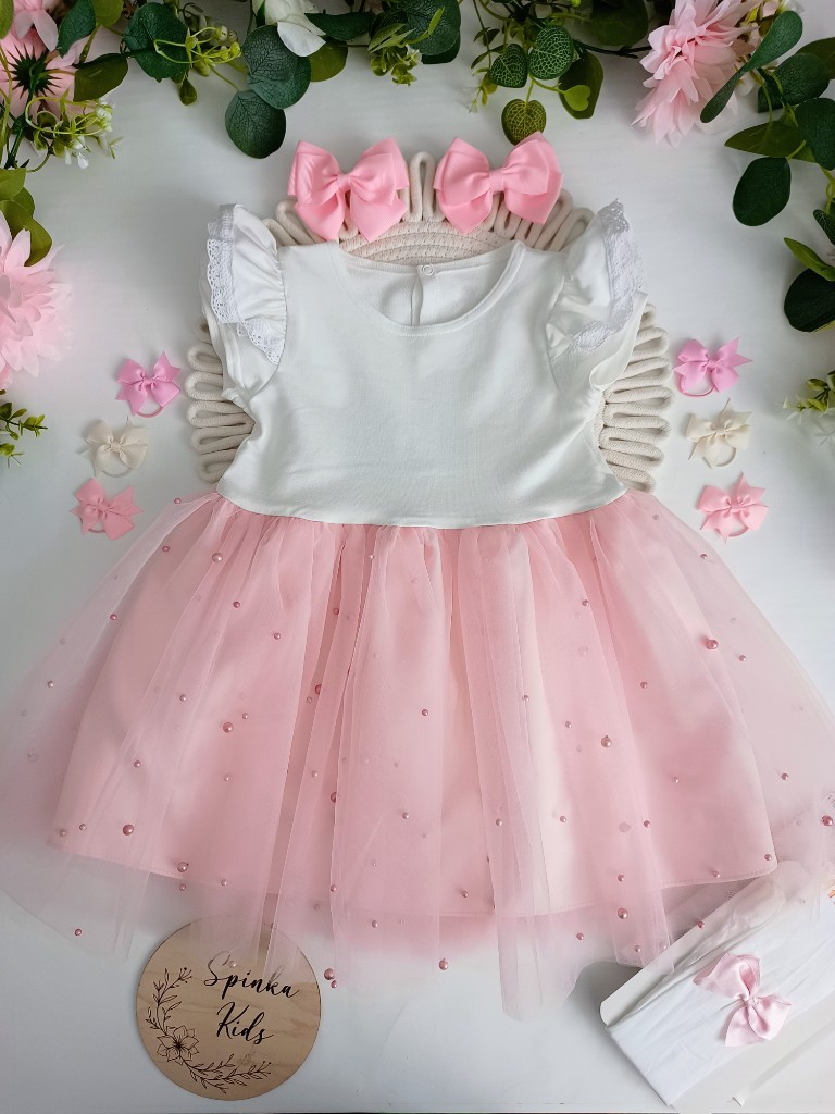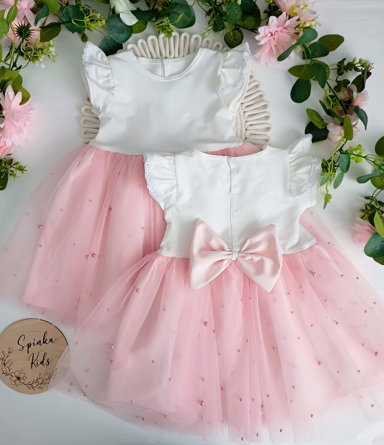 Obwód klatki 58 cm; Długość całkowita mierzona od ramienia do podszewki 56 cm, a do końca tiulu 59 cm.