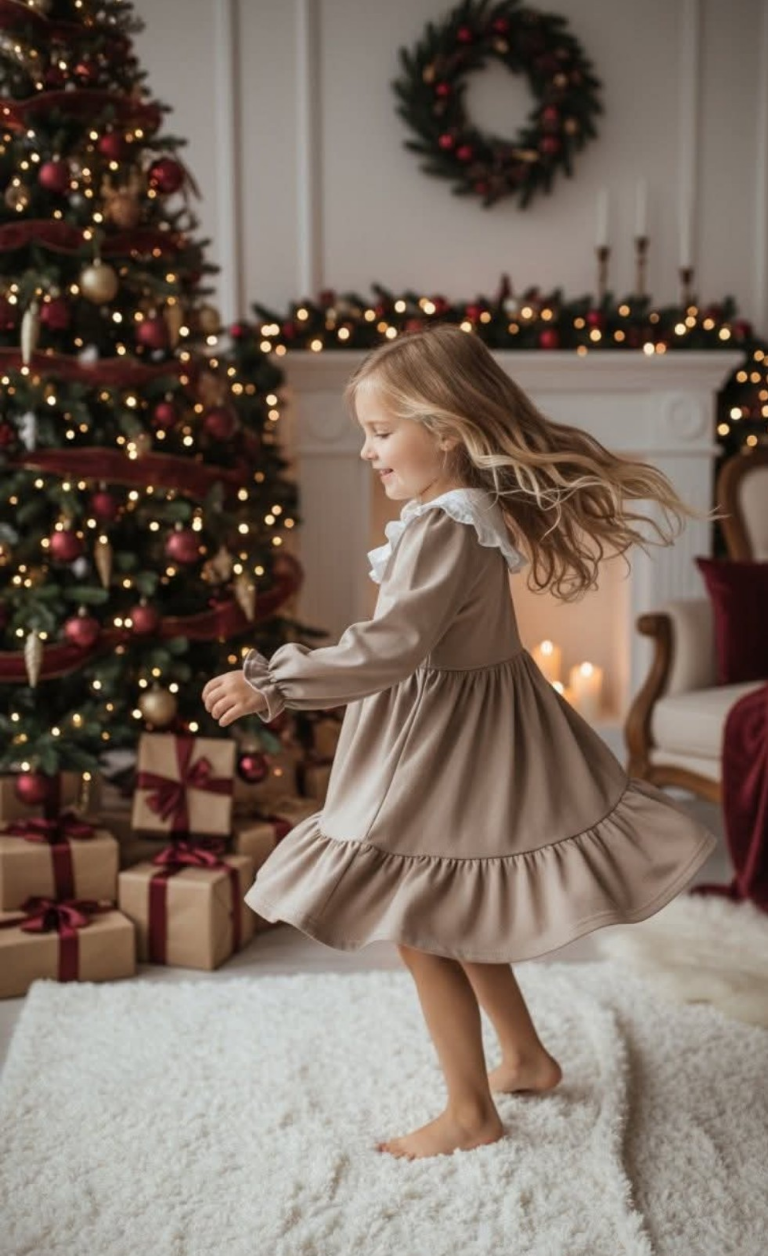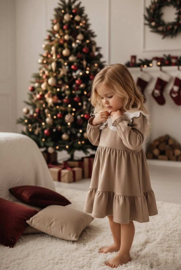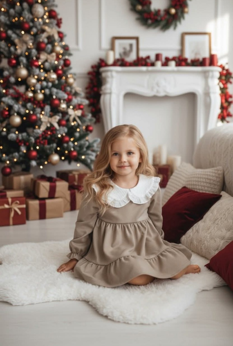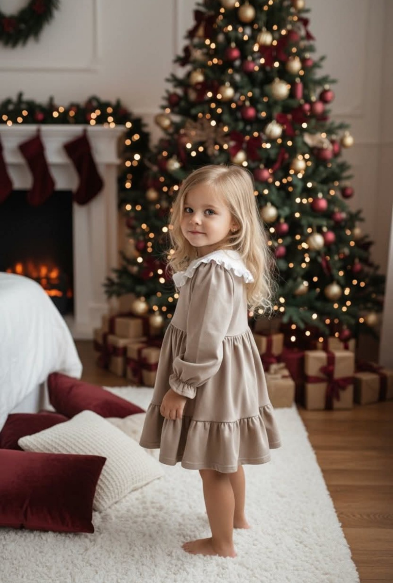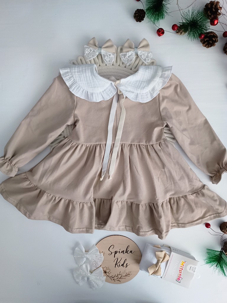 Piękny model sukienki świątecznej z muślinowym białym kołnierzykiem. Rękaw bufka wykończony gumką i delikatną falbanką przy rękawach. Z yłu wiązana welurową wstążką w kolorze sukienki. Piękny fason baby doll ale nie szerokiej lecz ładnie taliowanej.