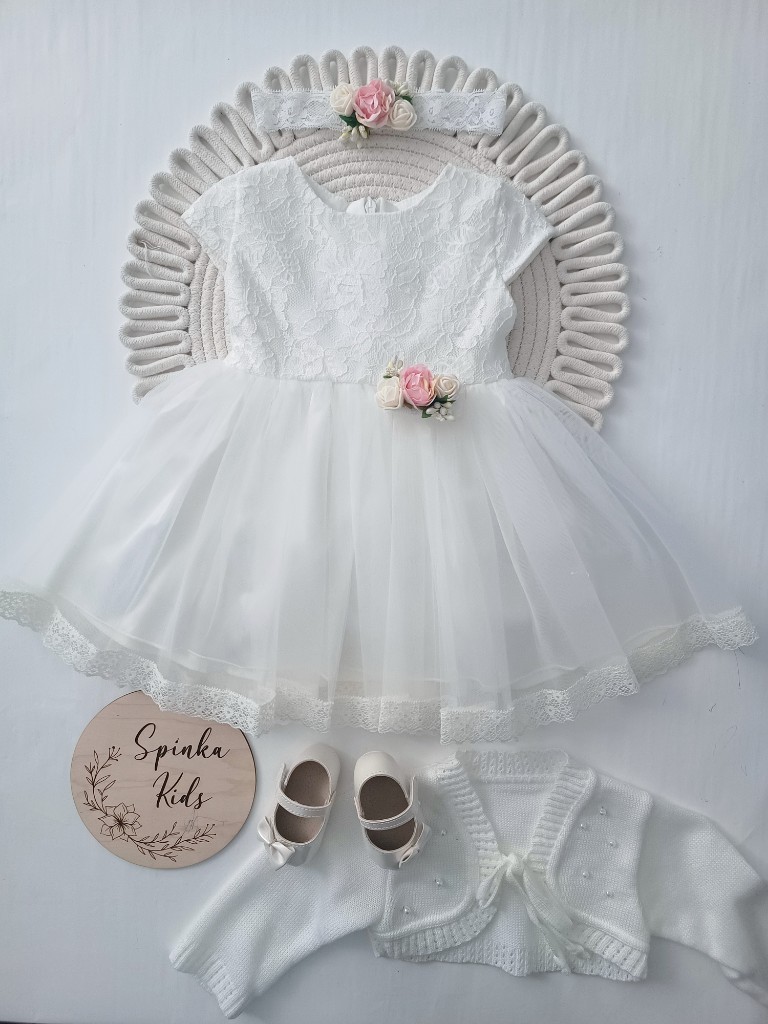 Polski Producent.Bawełniana podszewka. Sukienka od góry ma piękną, miękką koronkę.Dół to miękki tiulwykończony również koronką. Z tyłu zapinana na zamek i ma paseczki do przewiązania w talii. Z przodu bukiecik w talii. Dodatki ze zdjęcia do kupienia osobno na naszej stronie.
