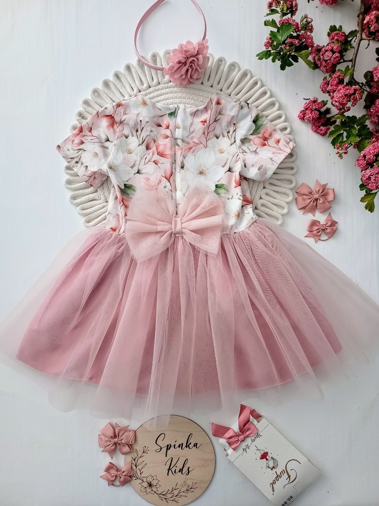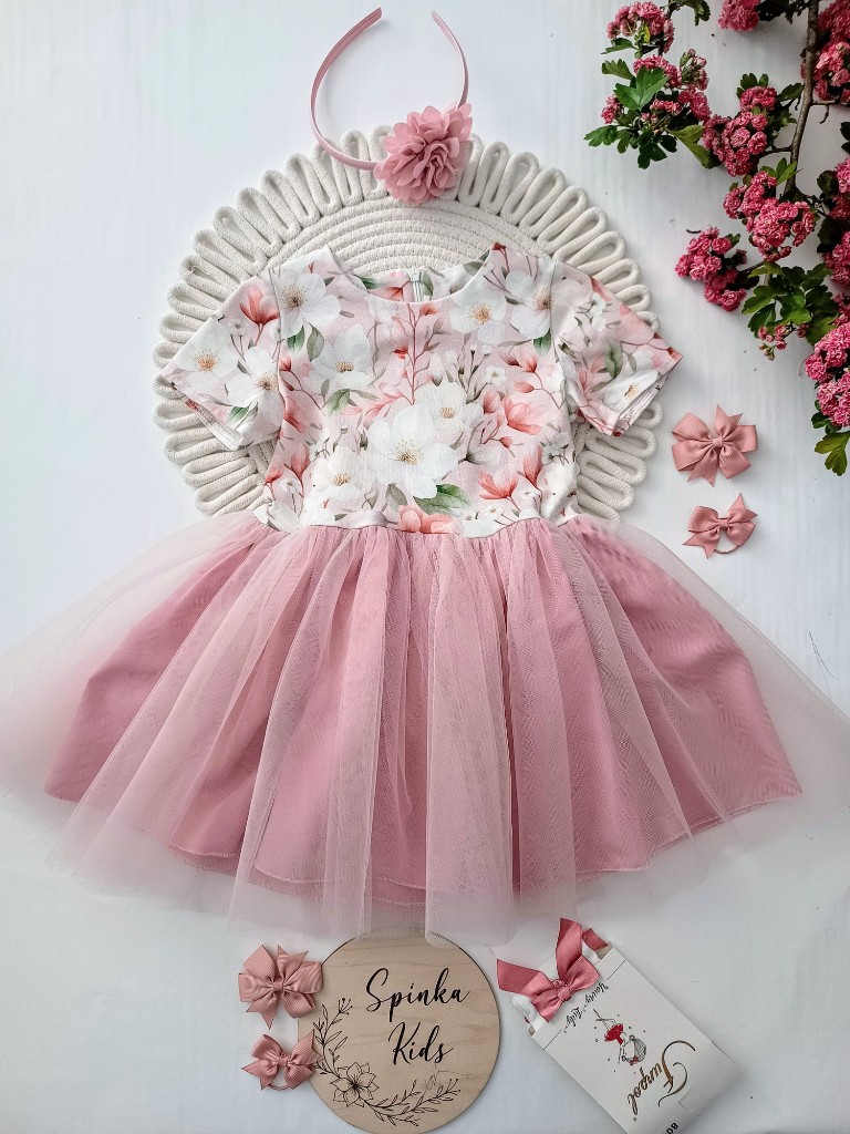 Polski Producent. Sukienka z piękną dekoracyjną kokardą z tyłu. Od góry bawełna z elastanem. Dół to miękki tiul. Sukienka zapinana z tyły na zamek. Ma z tyłu gumeczkę w pasie, aby spasować się do sylwetki.