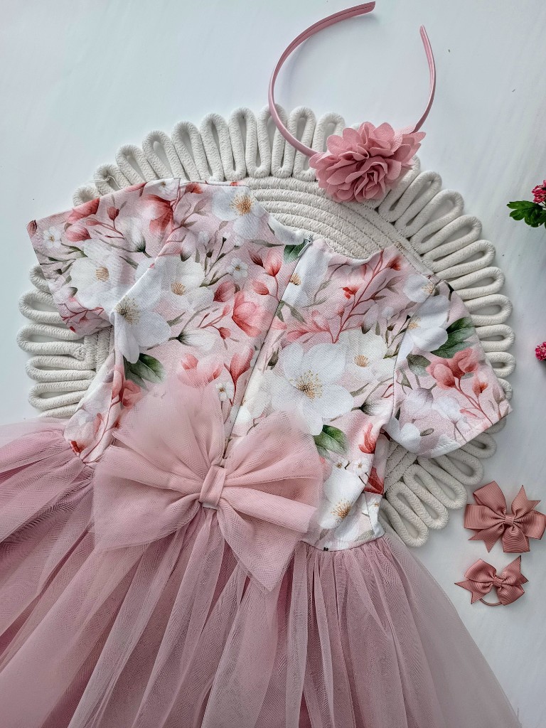 Tiulowa sukienka z dużą kokardą z tyłu – pudrowa