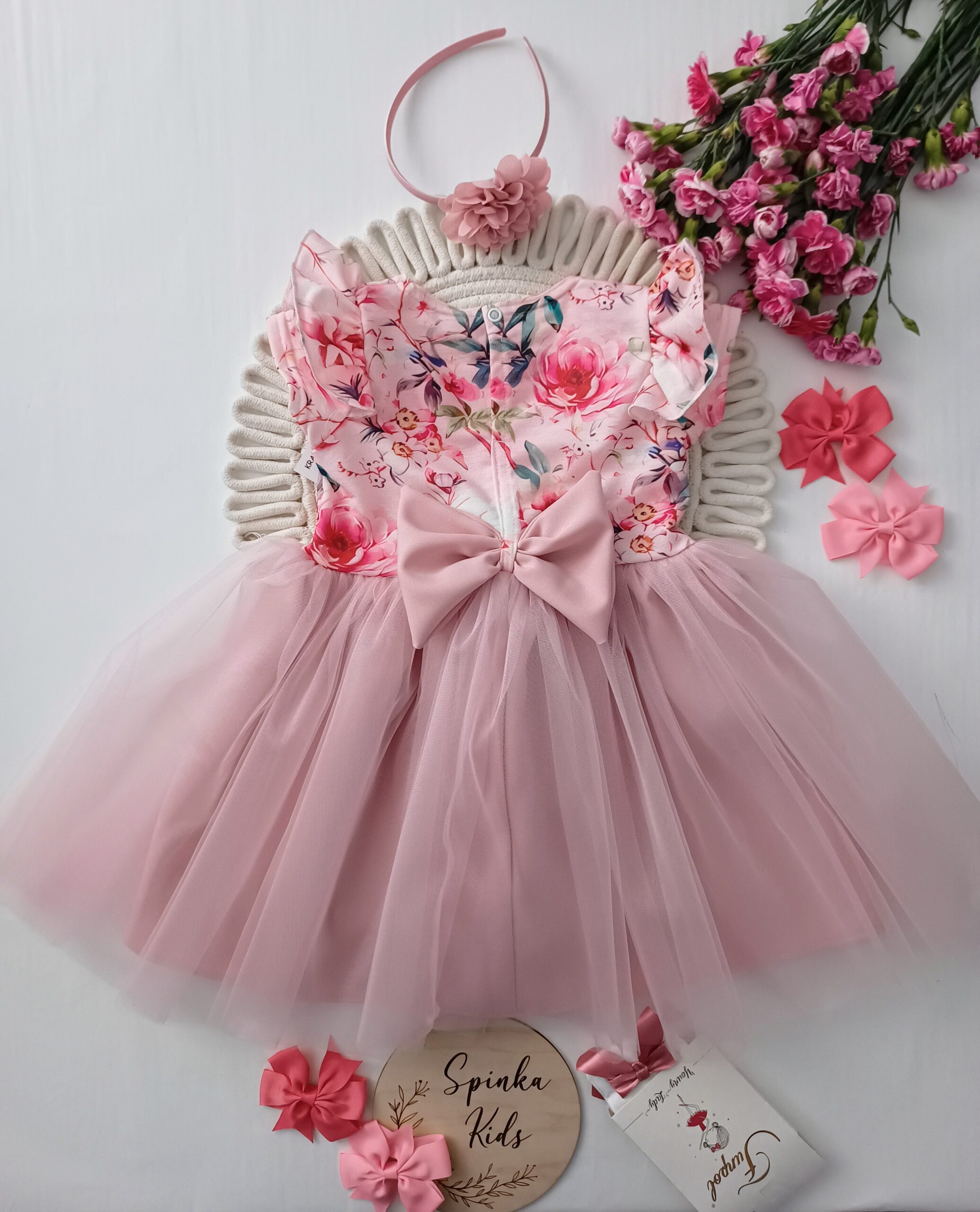 Polski Producent. Sukienka bawełniana z elastanem i tiulem u dołu.. Lekko się uciąga. Zapinana z tyłu na napkę. Z tyłu dekoracyjna kokarda.